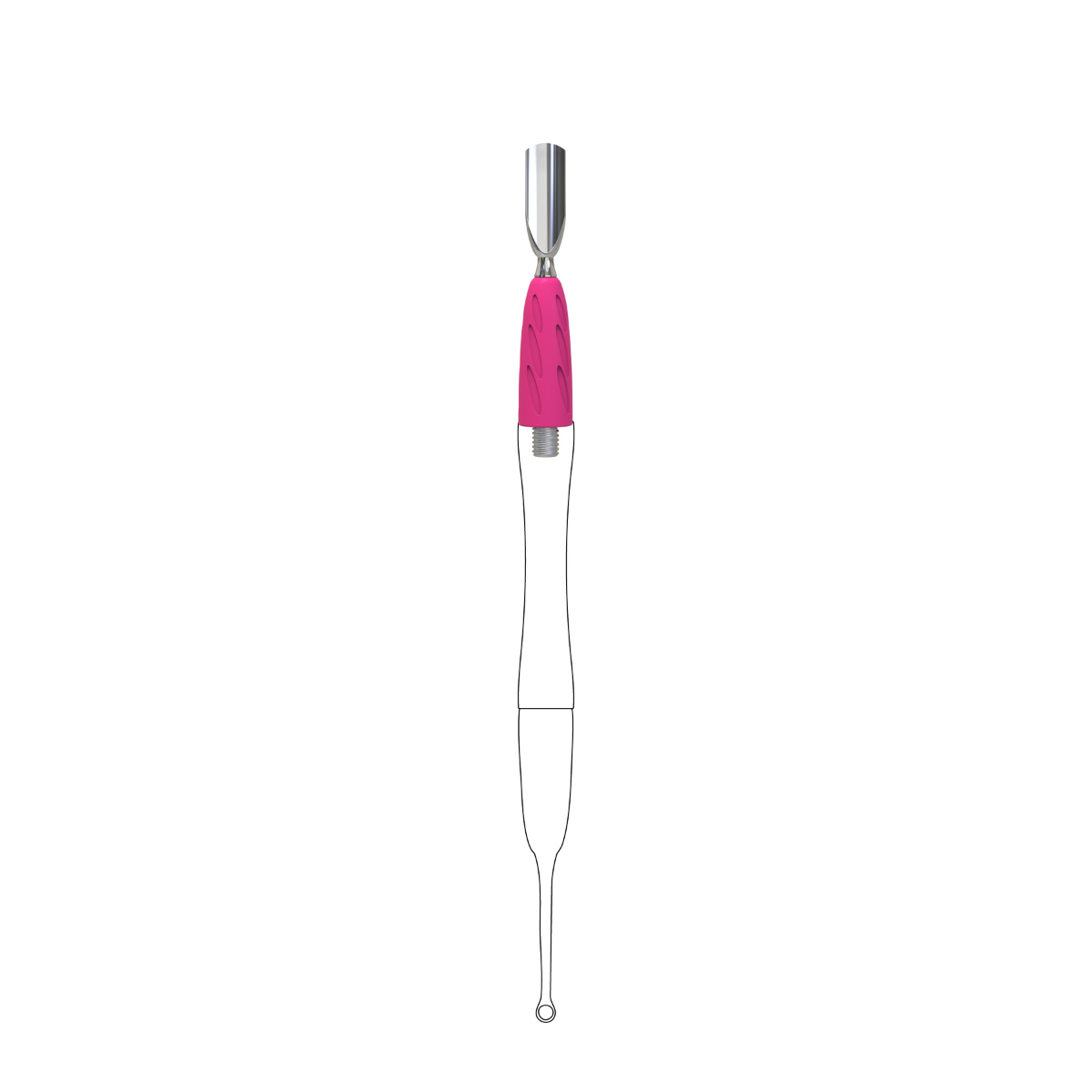• O “empurrador estreito arredondado” foi projetado para levantar e empurrar a cutícula para trás para remoção subsequente durante manicure e pedicure;